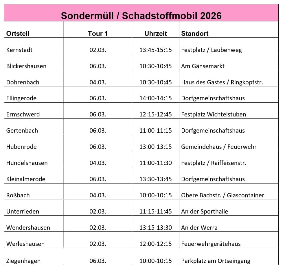 Im März 2026 führt der Werra-Meißner-Kreis wieder die Sammlung von Kleinmengen Sonderabfall durch. Auch die Ortsteile der Stadt Witzenhausen werden dabei angefahren.